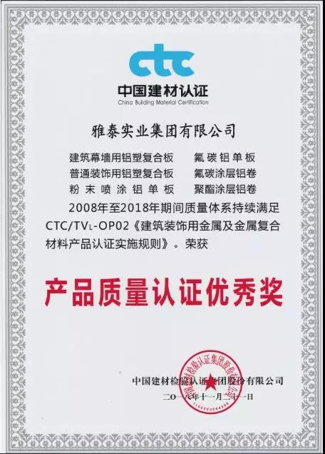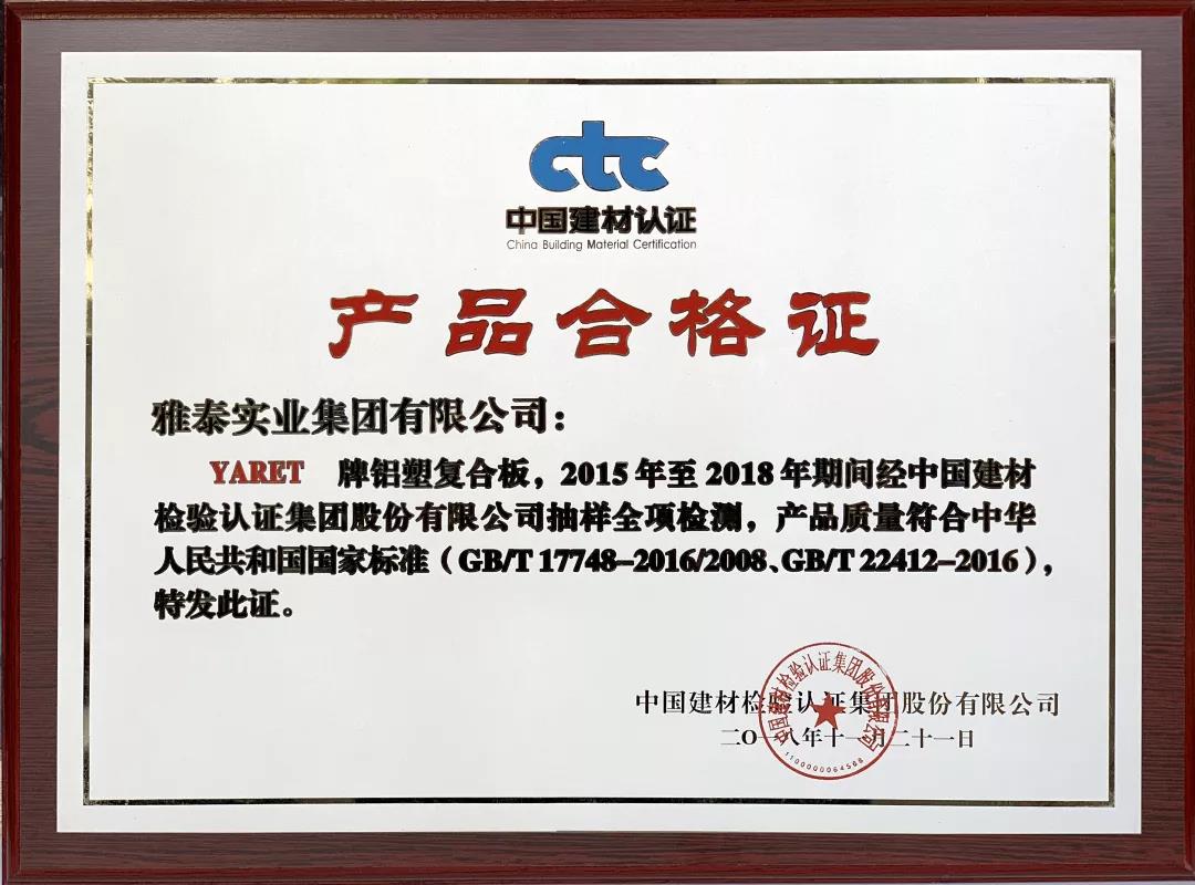 會上,雅泰產品憑借2008年至今2018年期間質量體系持續(xù)滿足CTC/TVL-OP02《建筑裝飾用金屬及金屬復合材料產品認證實施規(guī)則》,榮獲2018年度CTC產品質量認證優(yōu)秀獎。YARET牌鋁塑復合板,2015年至2018年期間經中國建材檢驗認證集團股份有限公司抽樣全項檢測,產品質量符合中華人民共和國國家標準(GB/T 17748-2016/2008、GB/T22412-2016),被授予2018年度產品合格證。